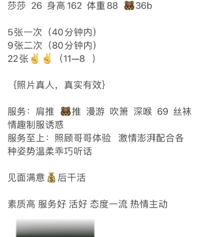 位置好找到地方遥控上楼,见到老师穿着制服若隐若现,女友感拉满,先帮我拿水然后坐着稍微聊了一会,洗完澡躺在床上,老师开始给我做服务,AB面服务都有,舌吻开局,舔背漫游,深喉花式吹箫舔蛋蛋,老师很会玩,深喉的时候差点给榨出来,口的也不错,服务做的舒服,感觉来了玩了69,毛少水多小穴很嫩,然后戴好雨伞让她坐上来,女上开始……非常配合,给老师干的哇哇叫,下面包裹感不错,辗转更换传教、女上、后入再传教,换了几个姿势最后后入冲刺,翘臀后入干的很爽,一会就交货,不催,服务态度好,全程配合女友感十足