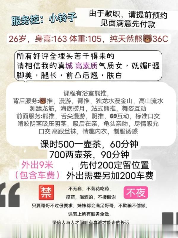 小区在地铁站附近,进门就看到一身黑丝感觉身材很棒,是我喜欢的类型,前凸后翘微微胖有肉感的那种,讲话声音好听,拉着我宝贝长宝贝短寒暄,情绪价值给的好,服务很卖力菜单上的前面背面都有做,没有敷衍了事,屁股很翘,后入非常爽,有一定性价比。